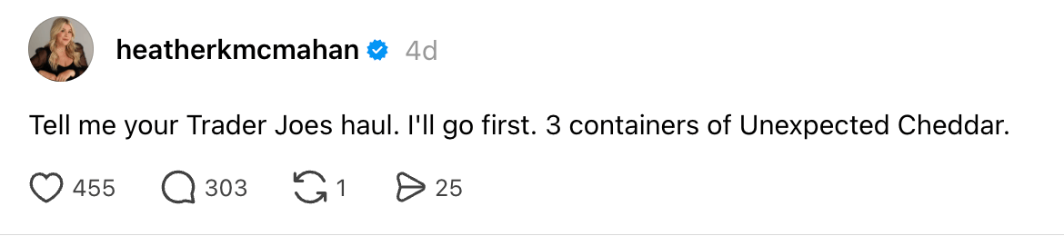 Hungry? Enjoy the unexpected recos that came out of Heather McMahan’s Trader Joes post this week.