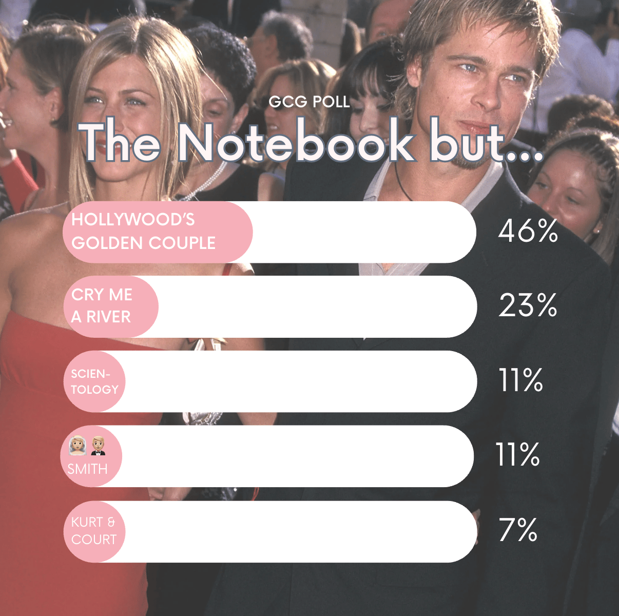 The couple that literally lives rent free in our brain is Brad Pitt and Jennifer Aniston, with 46% of you wanting to see their story on the screen. (also shout out to the girlie who reminded us of this).