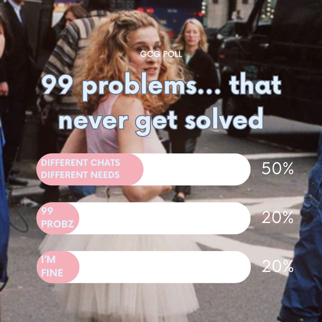 Results revealed that 50% of you have different chats for different needs, while about 20% equally said they do this constantly, and 20% said they do it rarely.