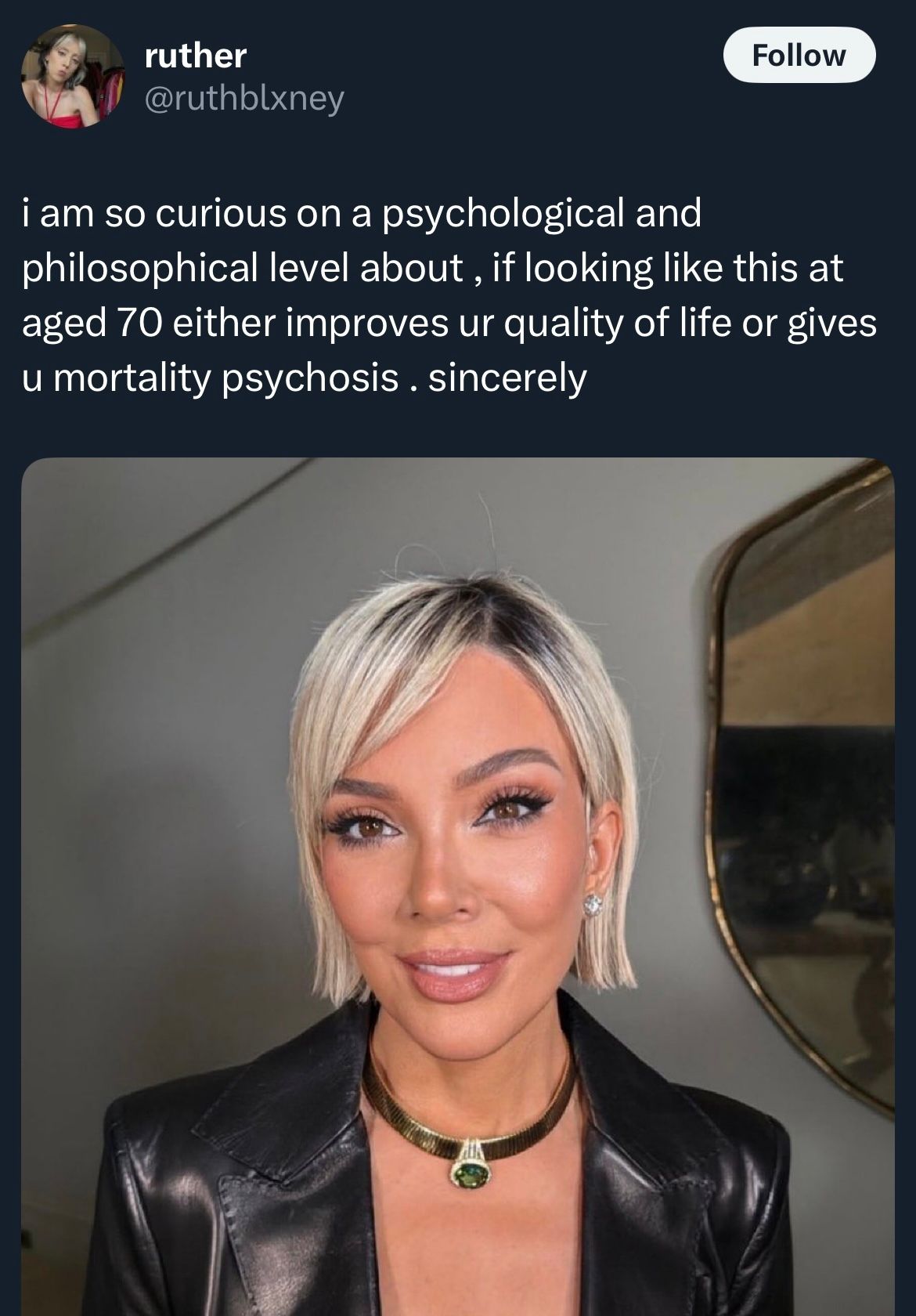💉 Fresh faces and a new fear unlocked? A lot of chatter recently about the facelifts and plastics work on Kris Jenner and Mandy Moore. This X user has presented a new monster hiding under the aging bed: mortality psychosis?! Expect a burning question at a future live show about this….