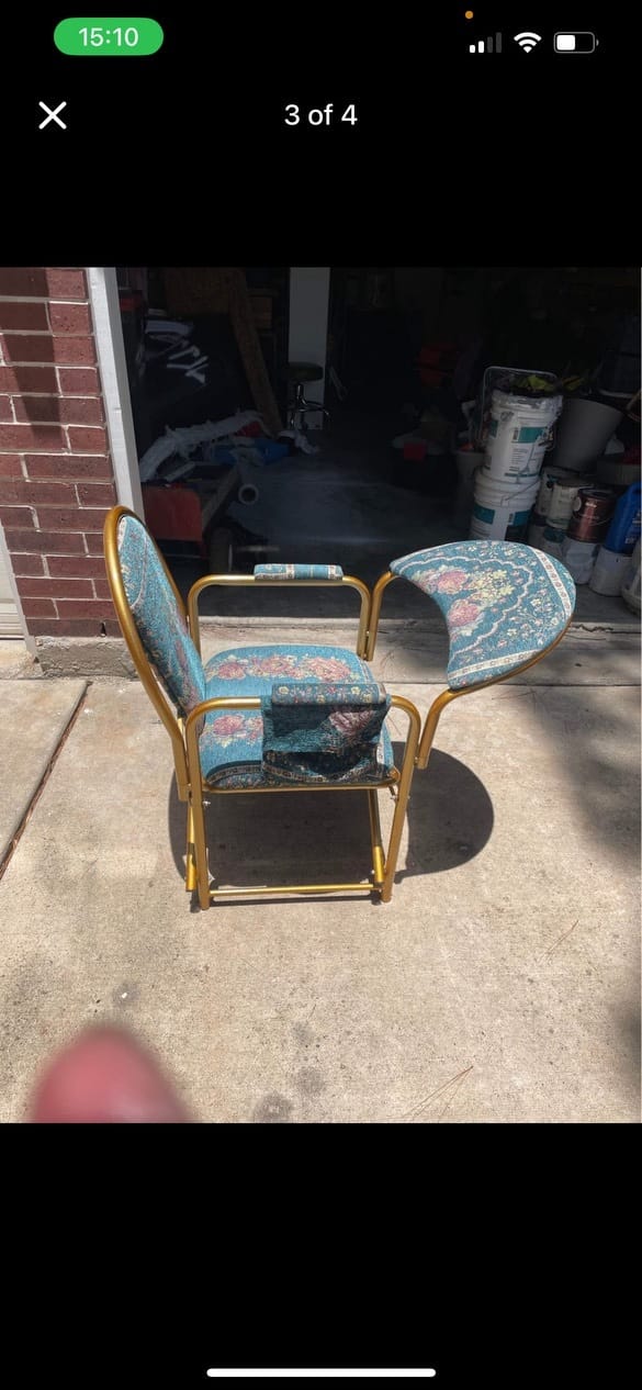 Carol here: my favorite part of Facebook Marketplace posts? The things BEHIND the item in question. Why do you have so much paint, a medical stool, AND this chair? I’m both scared and intrigued.